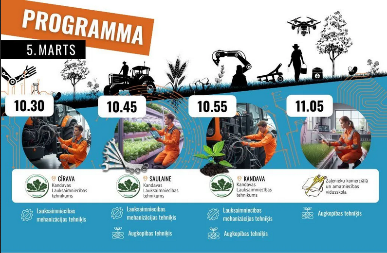 Skolēni ieguva informāciju par šīm specialitātēm, kas ir īpaši pieprasītas lauksaimniecībā. E-konferencē par izglītības iespējām pēc 9. klases stāstīja Kandavas Lauksaimniecības tehnikuma Cīravas teritoriālās struktūrvienības, Kandavas Lauksaimniecības tehnikuma Saulaines teritoriālās struktūrvienības, Kandavas Lauksaimniecības tehnikuma un Zaļenieku Komerciālās un amatniecības vidusskolas audzēkņi un mācībspēki.