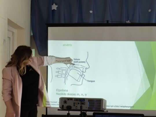 Ilze Ozola prezentēja savu maģistra darbu par tēmu “Rinolālija”. Tika rādīti rinolālijas traucējuma smaguma pakāpes, veidi. Ilze stāstīja par pirms operācijas un pēc operācijas periodiem un korekcijas darba organizēšanas posmiem.