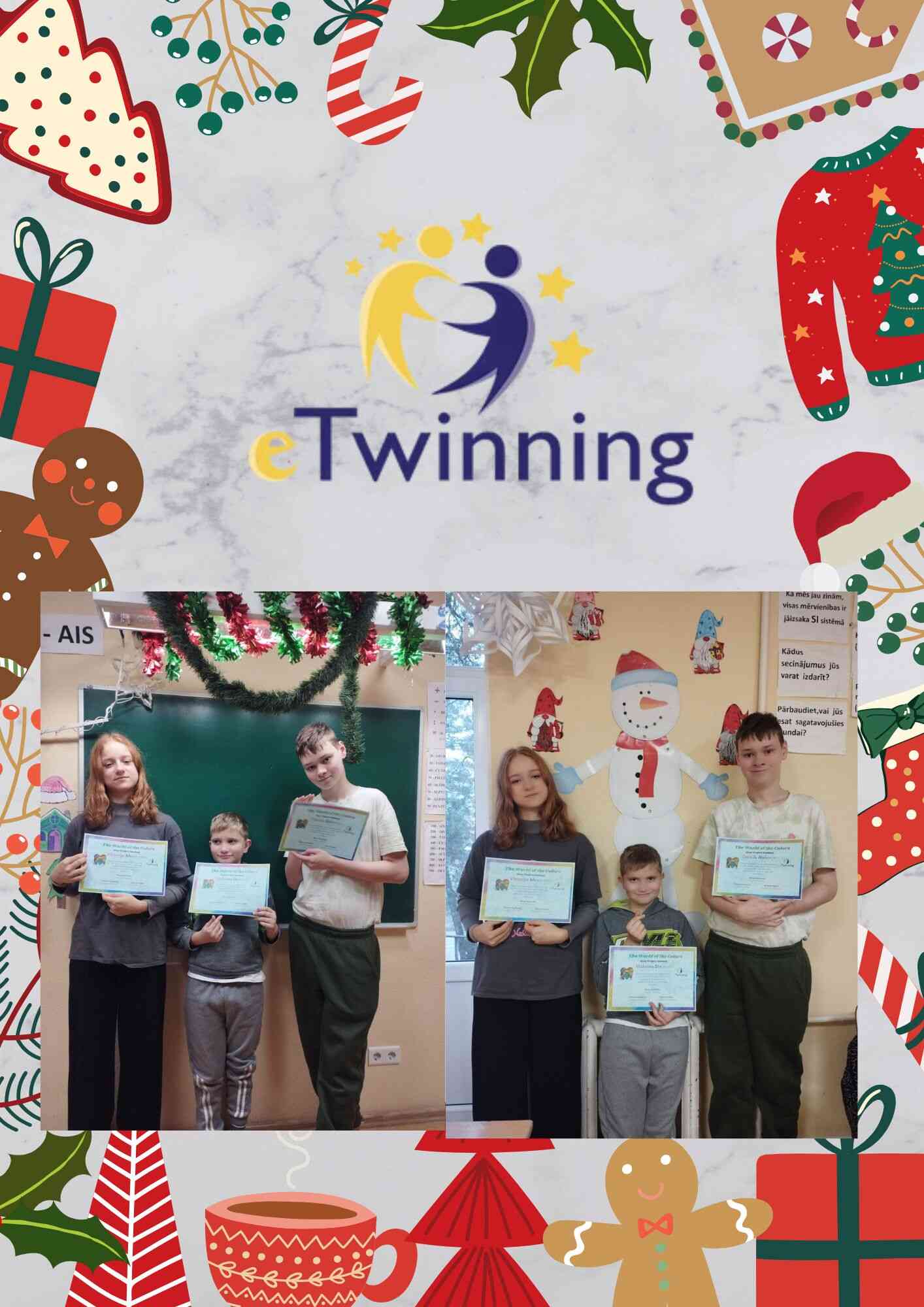 Sagaidot Ziemmassvētkus mūsu izglītības iestādes 1. grupiņas audzēkņi ar īpaši radošu un starptautisku noskaņu aktīvi iesaistījās eTwinning projektā “Ziemassvētku apsveikumu kartīšu apmaiņa starp speciālās izglītības iestādēm” Projekta ID: 170580. Šīs ieceres galvenais mērķis bija sniegt bērniem iespēju tuvāk iepazīt citu tautu tradīcijas un kultūru, kā arī veicināt draudzību starp dažādu valstu audzēkņiem, kuriem ir īpašas vajadzības.