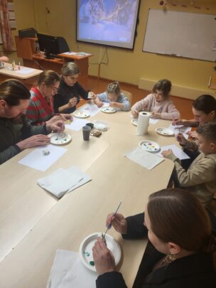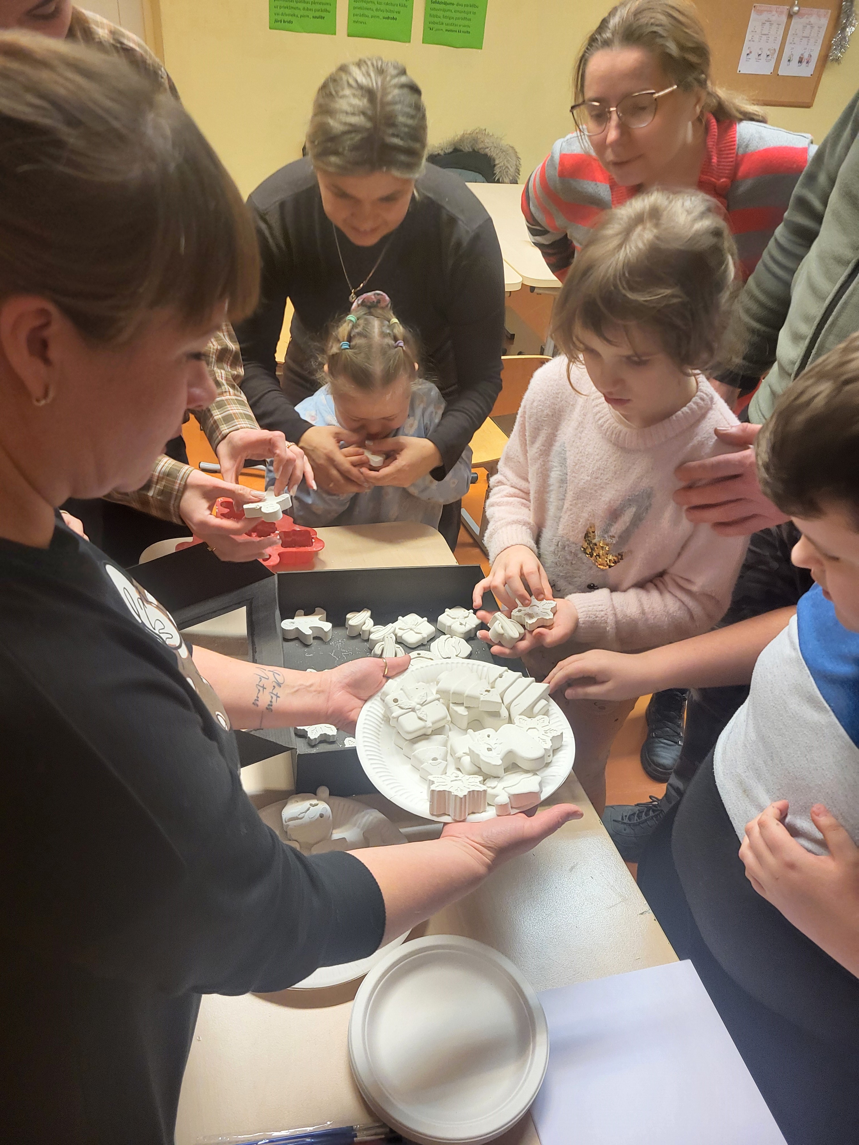 Skolas Dizaina un tehnoloģiju skolotāja O.Lasmane pasākuma turpinājumā rādīja, kā pēc speciālām receptēm no ģipša maisījuma un silikona formām var izveidot paraugus mājās. Kopā ar pasākuma dalībniekiem egles rotājumi, figūras un dāvanas tika krāsoti ar akrila krāsām.