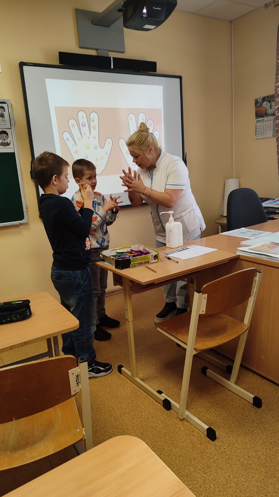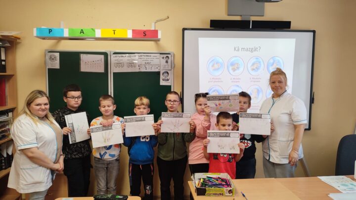 Nodarbības laikā skolas ārstniecības personas pārrunāja ar skolēniem par roku mazgāšanas nozīmi, noskatījas videoklipu “Mistera Ziepiņa roku mazgāšanas dziesmiņa”, iepazinās ar pareizu roku mazgāšanas secību un praktiski mācījas, kā pareizi mazgāt rokas. Nodarbības procesā skoleniem bija piedāvāts apvilkt savas plaukstas un uzzīmēt dažādus mikrobus uz plaukstiem. Izgriezt un piestiprināt plaukstiņas redzamā vietā klasē, lai vienmēr atcerētos rokas nomazgāt.